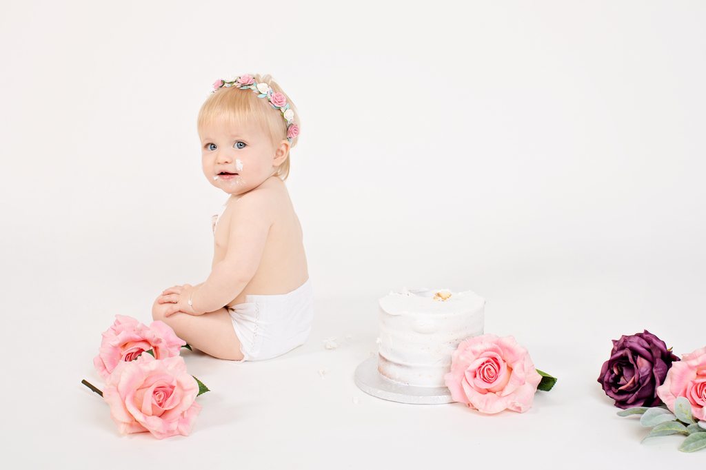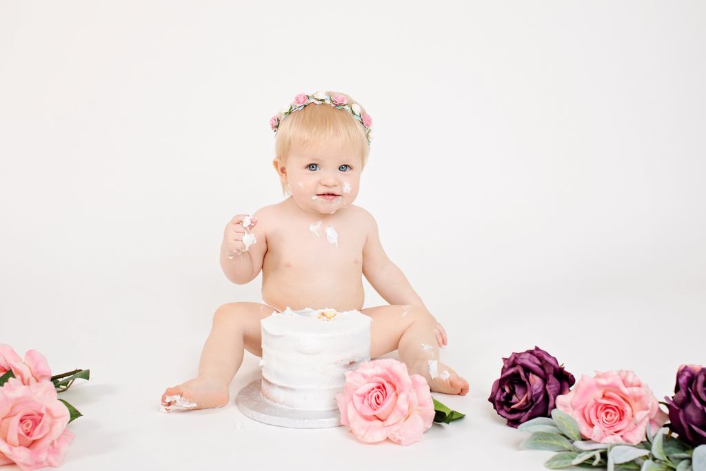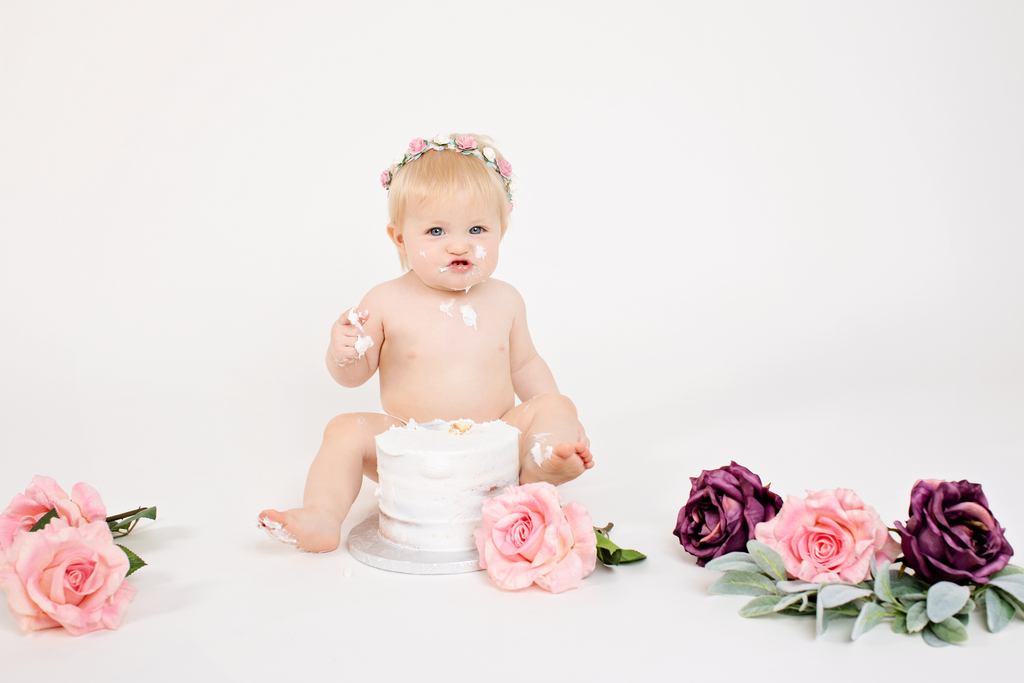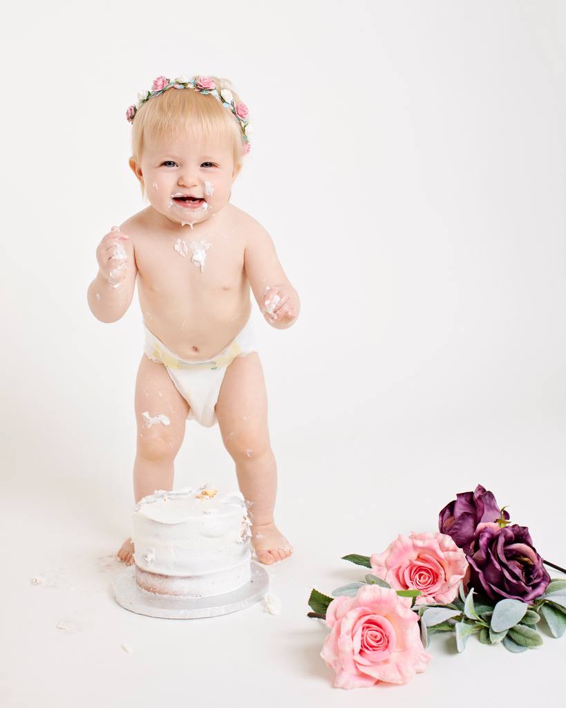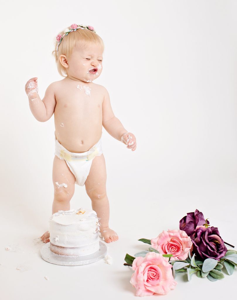Look at this little girl, she is toddling and being a baby model like a pro. She poses like a pro. A one-year session is always a blast, and I love this cake smash. She was ready, and so game to dive right in there. Plus, how cute is it that we kept the flower-theme through most of the settings we played in? That is a major plus of doing sessions in the studio. We can switch up backdrops and settings all we want.