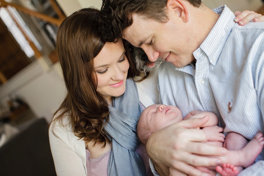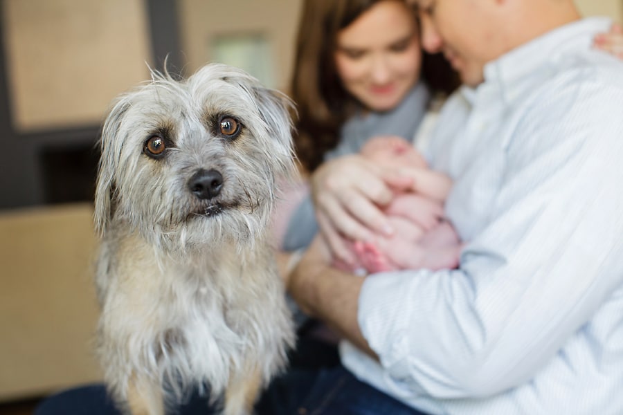 Got to do an in-home newborn session recently where the family’s fur baby puppy wanted to steal the show. You can even see him peeking through Mom and Dad’s heads in one shot. For many people, their pets are valued members of the family – there’s a reason we call them “fur babies” – and in-home sessions make it especially easy to include them in family portraits.