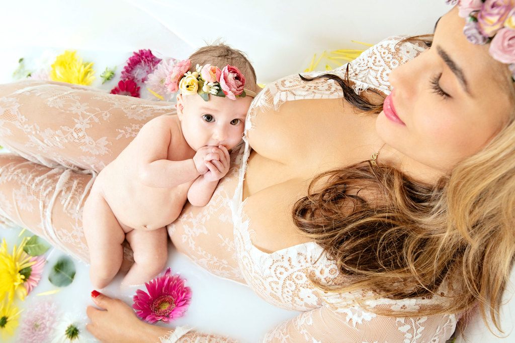 Having worked with this Mama, previously, we decided that this session would have a different theme than her first newborn and maternity sessions. This time around, she is welcoming a baby girl into their lives. Which gives us the best excuse to use all the pinks, purples and flowers that we could ever want. We also decided to keep this newborn session really close in style to her maternity shoot. We did two milk bath sessions with very similar colors, but different flowers. Keeping them cohesive is perfect if you want to do an album where both sessions will be displayed.