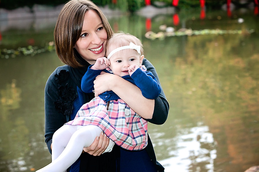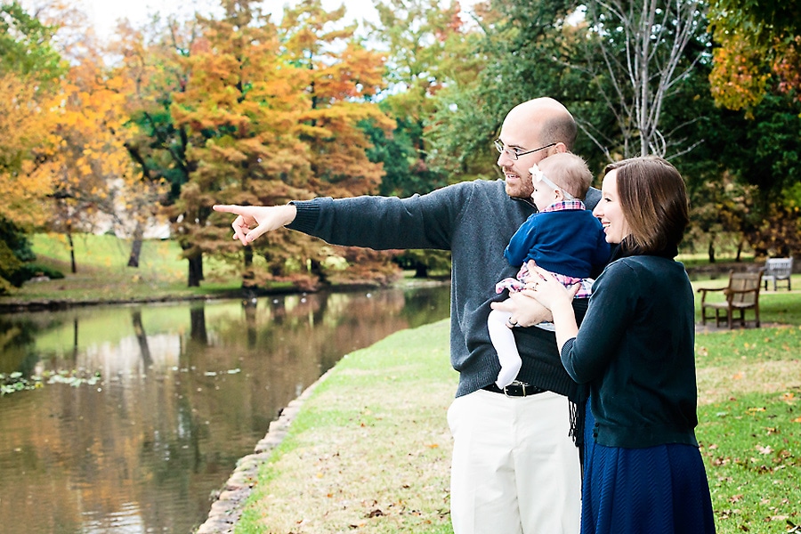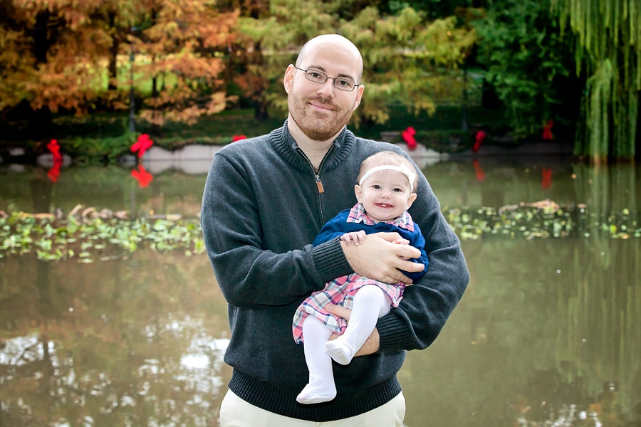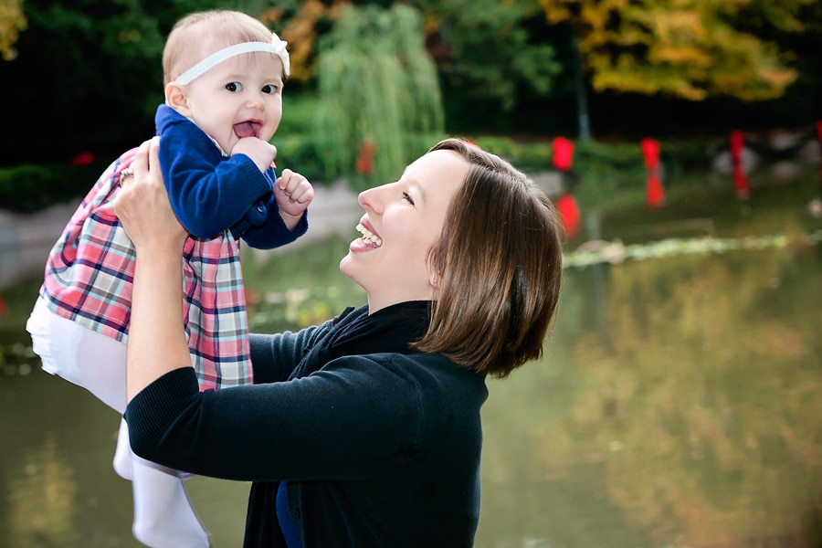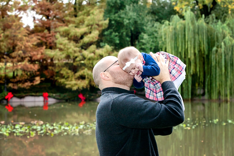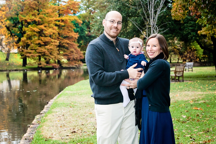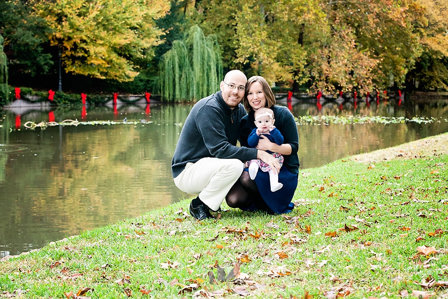 In all seriousness though, I love the beautiful fall colors of the leaves with the bright red holiday bows in these shots. And the happy new parents and giggly baby in her holiday dress are enough to warm the coldest hearts.