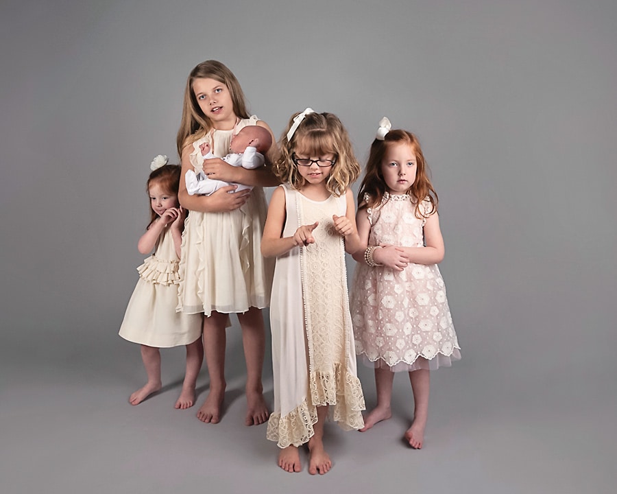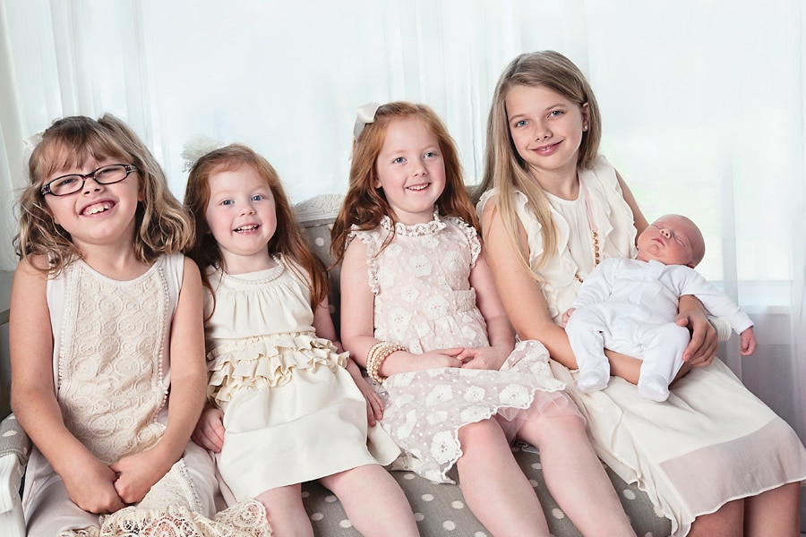 Today’s blog features four big sisters welcoming their new baby brother with a family photography session combined with a newborn photo session. I’ve had the pleasure of photographing four of these children before, for a newborn/family photo session a few years ago. They have grown into lovely young ladies. Each has a vastly different personality from the others. This really shows in one of the shots below where each girl is “doing her own thing” while happily posing with baby brother. Funny stuff.