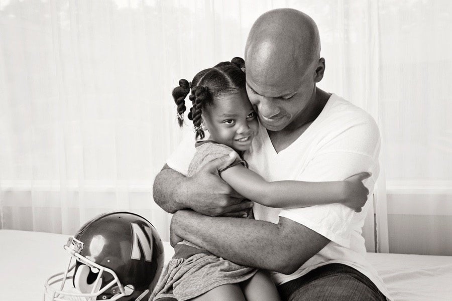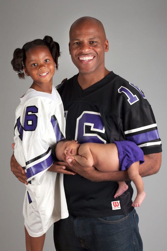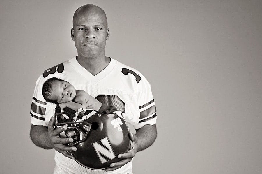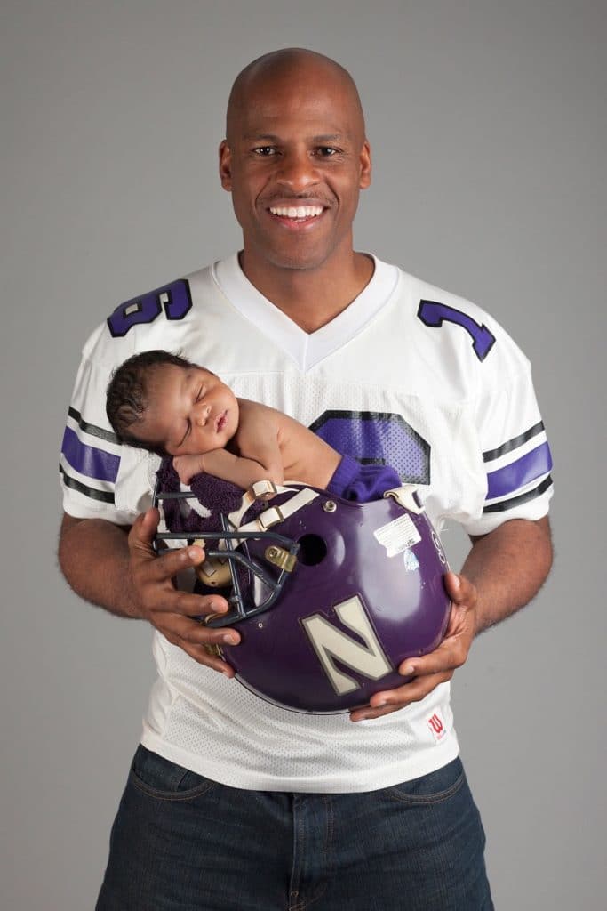 Today, I’m sharing the 1 month old newborn photography of a Dallas family (see the mom’s stylish maternity photos here). Dad was a bigtime football player and his new daughter is being welcomed into a family that loves the sport. We included a football helmet, jerseys, and a diaper cover in the team color purple. She looks positively precious, especially when she’s in the helmet. These were the perfect infant photography props that added something meaningful.