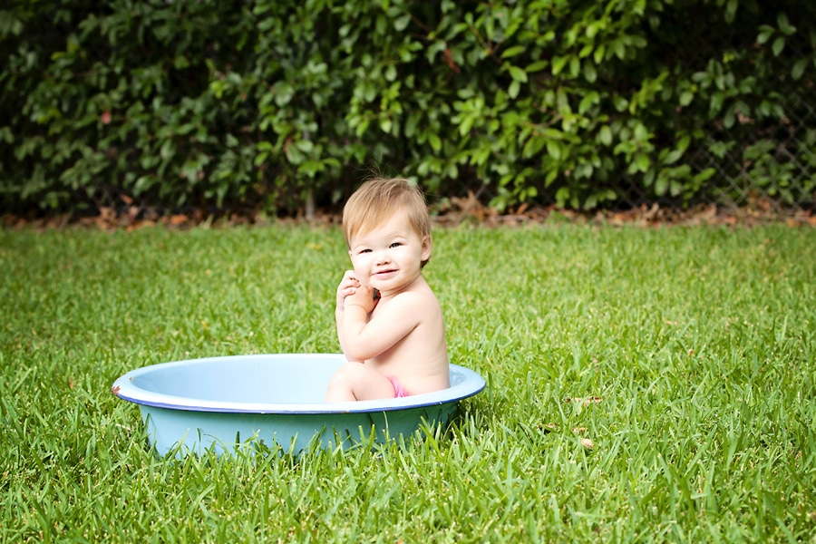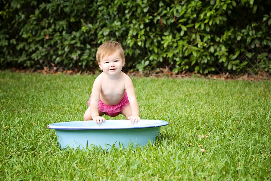 Outside she had more fun and let a few smiles out as she got in the tub… and climbed back out… and got back in… ad infinitum. Lots of fun to be had by this important baby task.