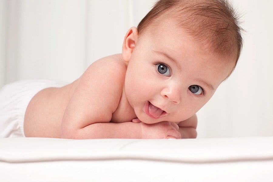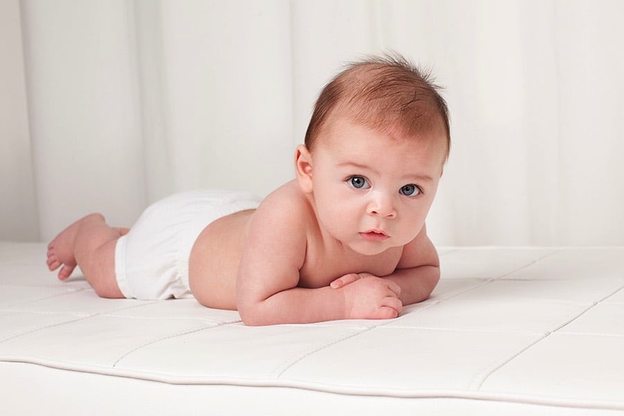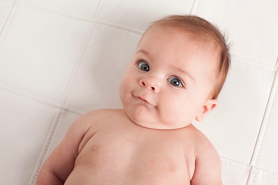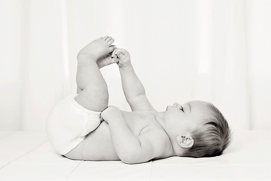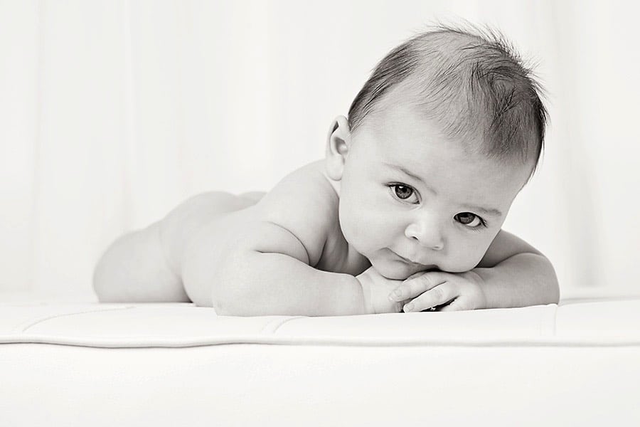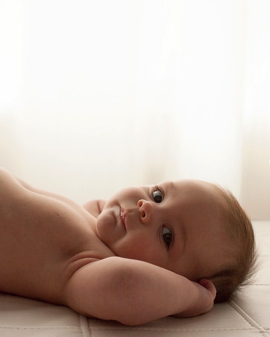 Today, I’m sharing the three month baby photos of a little boy born through a surrogate. His mom and dad are so, so thankful to have him and it showed. They didn’t take newborn photos, so they wanted to get in right away when he was three months old. This is a wonderful age for professional photos! Babies are alert and adorable with some quality rolls. In addition, they can do things like grab toes and look right into the camera. In fact, grabbing the toes is a three month milestone to capture.