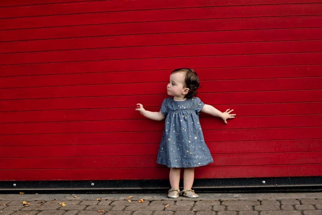 For this one-year shoot, we also thought it would be fun to get the whole family involved, big brother and all. It was so cute to see them together and to really try and capture the whole family’s vibe. I also love that with her six-month shoot we kept it really subtle. Nothing crazy, just a cute little bow. But with this one-year shoot, we went bold. The red wall turned out to be one of the cutest spots ever and really added some “pop” to the session.