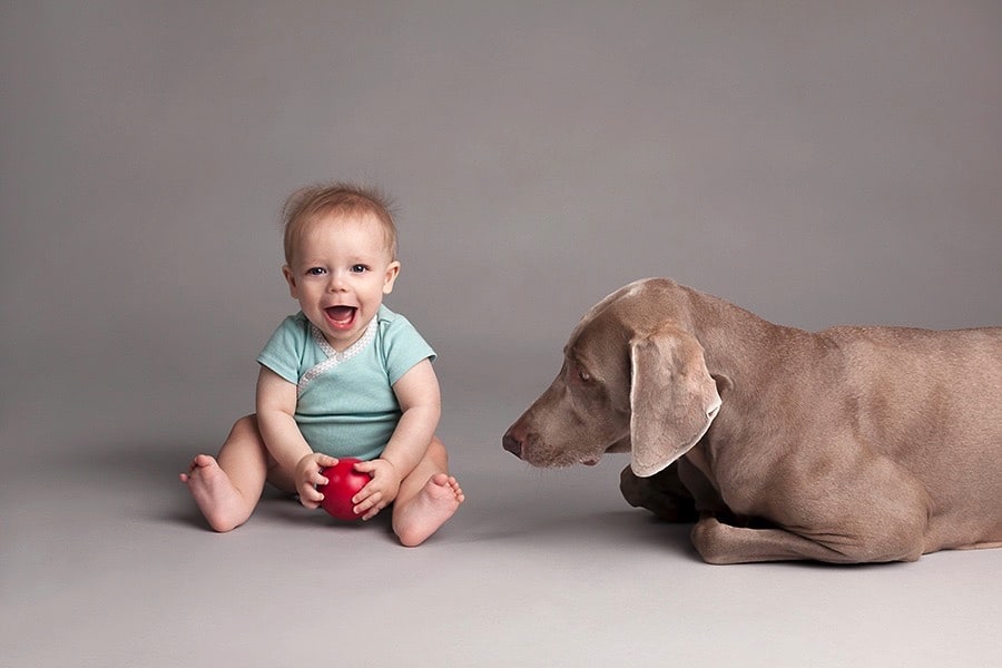 Not all pets make for good photo companions, though. Your dog should be well-behaved and calm enough for a long session. Not all animals are able to be that patient. I recommend a dog that has been through obedience training and is beyond the puppy wildness/goofiness that’s natural in a young dog. This Weimaraner fit that description perfectly and he happily hung out in my studio while we took smaller group shots of the humans at this event. Very good boy.