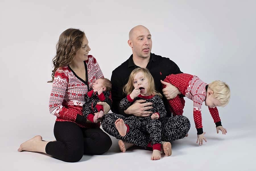 Today, I’m sharing a newborn photo shoot of an entire Dallas family, who were overjoyed to welcome a baby boy as their third child, joining older twin brother and sister. Mom and dad make some of the cutest babies in the world. Check out the twins’ six-month photo shoot and tell me I’m wrong! I still think of those adorable babies! Mom and dad also had a great sense of fun: everyone wore matching holiday jammies for this photo shoot. All five of them played and interacted.